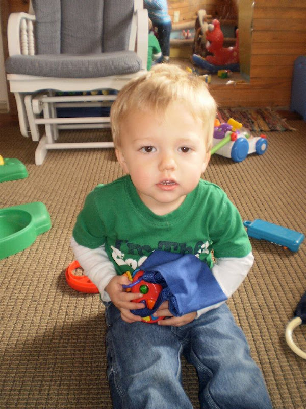 Last week, his teacher mentioned the daycare had a new facebook page! We all know how addicted I am to facebook, so I totally checked it out. And they have some adorable pictures of my little man! I saved them to share with you all here. I love seeing what he's like when I'm not around. :)